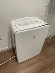 じゃーどーしろってんだよ。っていうと、衣類乾燥機なるものがあるんですよ。エアコンの冷房と逆の動きで空気から水分を取って少し暖かい温風を洗濯物に当てていくと、洗濯物が乾いていくというやつ。衣類の間隔をあけて狭い部屋で使うと早く乾くよ。空気から取った水分がタンクに溜まるので、時々タンクに溜まった水を捨てる必要はあります。この写真の衣類乾燥機は前方に風をおくれるようになってて、背面を壁に寄せて運転できるから、邪魔にならないというので買ってみました。