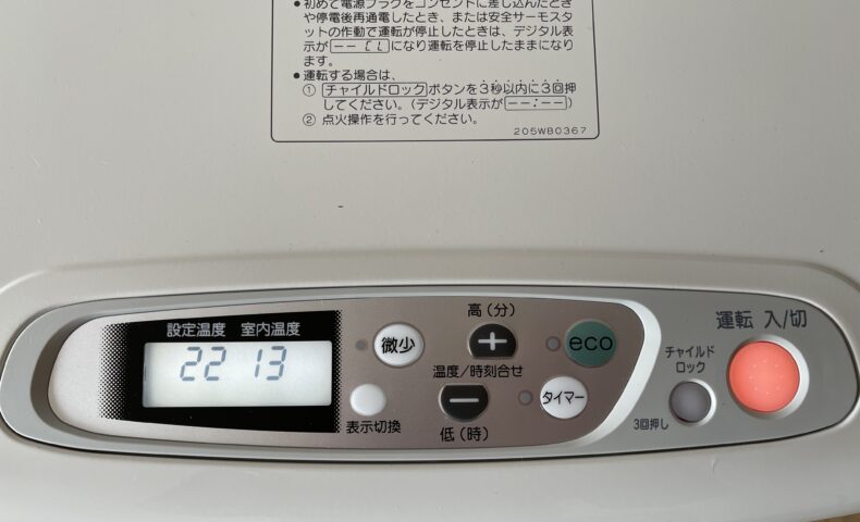 ストーブはスペースネオ。時計を表示するところに「CL」の文字。チャイルドロックの略ですね。子供が押しても運転しないようになってるけど、大人がやっても動かないんですよね。チャイルドロック解除ボタンを3回連続で早押しして解除完了。時計とタイマーを合わせ、操作を説明して、普通に使えるようになりました。